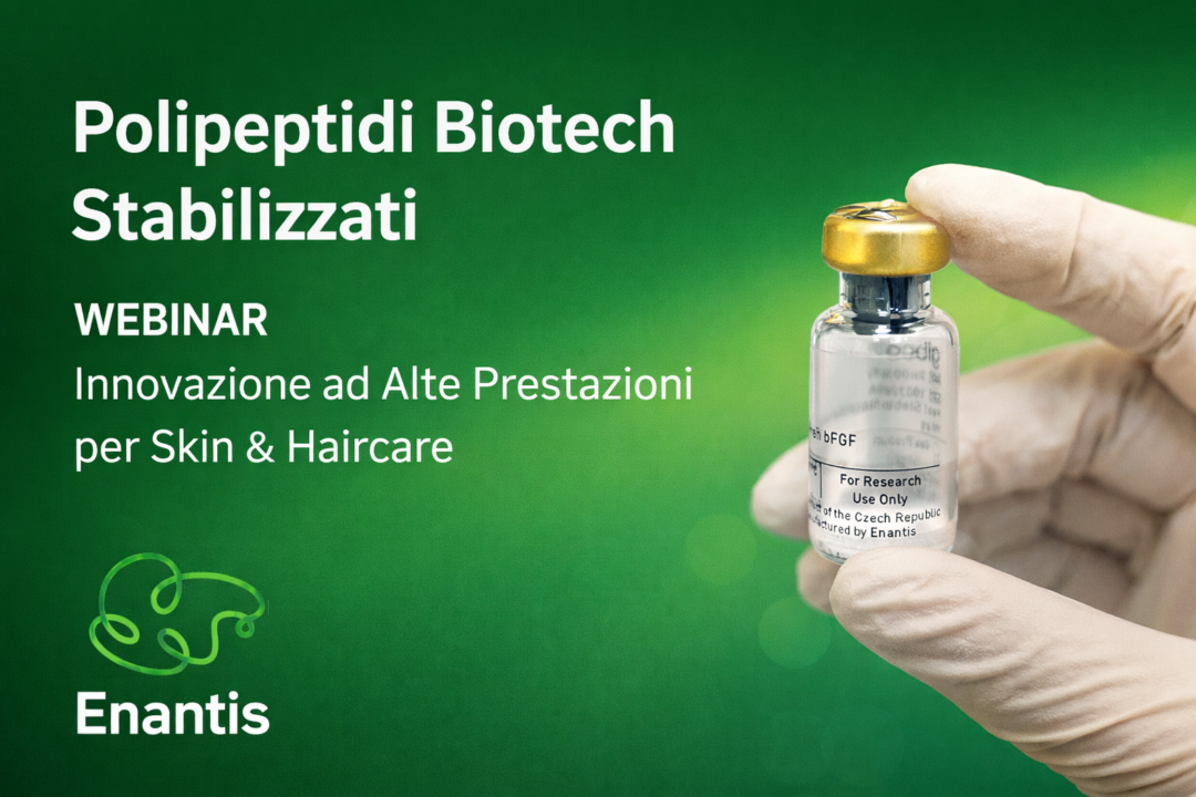 Partecipa al webinar dedicato alle soluzioni biotech avanzate di Enantis e scopri come i polipeptidi stabilizzati stanno ridefinendo gli standard di efficacia e stabilità nel mondo cosmetico. Approfondiremo le tecnologie alla base di FGF2-STAB® e FGF10-STAB®, attivi brevettati, 100% naturali e altamente performanti, studiati per supportare la rigenerazione cutanea, migliorare l’elasticità della pelle e favorire la crescita e la densità dei capelli. Un appuntamento imperdibile per chi vuole portare innovazione concreta nelle proprie formulazioni.